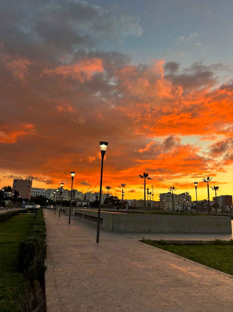 Finally my friend Ashley arrived, and we took the old, regional train into Casa Blanca. Looking out the rumbling, rattling train window, watching the clouds, I knew we would be greeted with a stunning sunset. Sure enough, when we got off the train in the large, modern central train station, the sky was showing the most stunning colors. Such a great welcome sunset in Casa. Then we had our first wild taxi experience. Which resulted in Zineb making the taxi driver stop, she told us to get out, so we got out, and went to find another taxi. The taxi drivers are very controlling and intense, and they even try to scam locals on taxi prices.